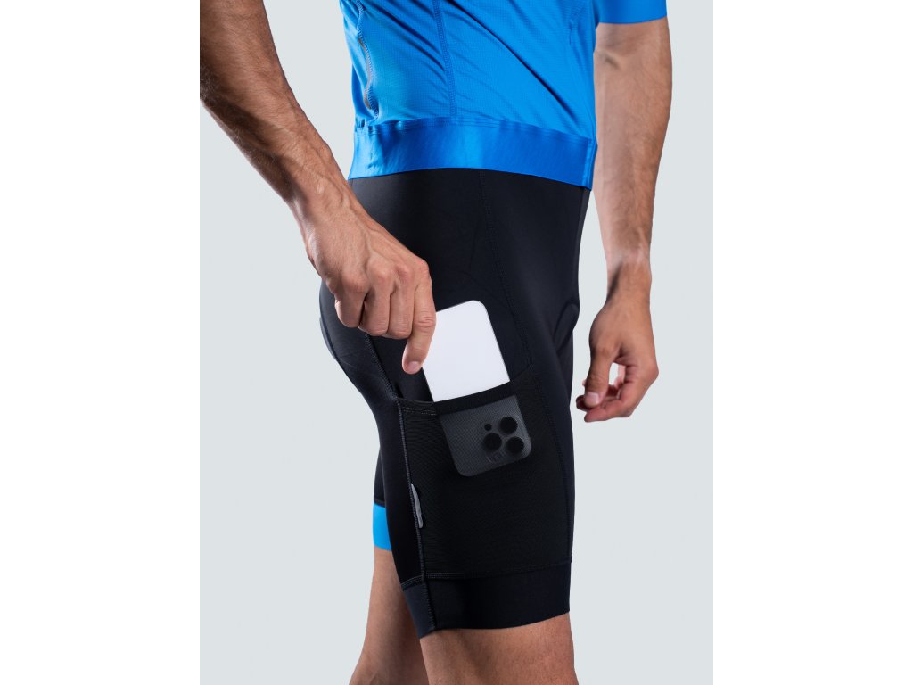 Dres je vyroben z technického mikrovlákna (polyester/elastan), které efektivně odvádí pot, rychle schne a zároveň umožňuje kůži dýchat i při vysoké zátěži. Anatomický střih se přizpůsobí tělu v pozici na kole, silikonový lem ve spodní části zamezí vyhrnování a tříkomorová zadní kapsa pojme vše důležité. Integrované šle drží kraťasy pevně na místě, aniž by se zařezávaly do pasu. Reflexní prvky zvyšují bezpečnost za snížené viditelnosti. Ideální pro silniční i MTB cyklistiku.