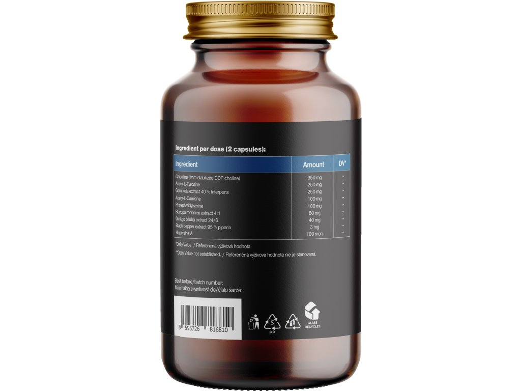 Složení: Citikolin (ze stabilizovaného CDP cholinu), Acetyl-L-Tyrosin, extrakt z Gotu kola 40% triterpenů, Acetyl-L-Karnitin, Fosfatidylserin, extrakt Bacopa monnieri 4:1, extrakt z Ginkgo biloba 24/6, extrakt z černého pepře 95% piperin,huperzin A, stearát hořečnatý. Rostlinná. kapsle na bázi HPMC. Bez obsahu balastních látek. Produkt je vhodný i pro vegany.