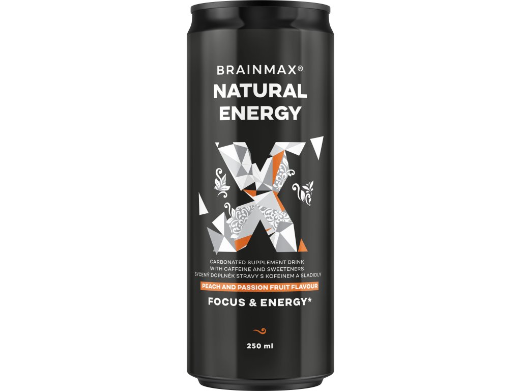 BrainMax Natural Energy, Broskev a marakuja, 24x250 ml Perlivý energetický nápoj, podpora mentálního i fyzického výkonu, doplněk stravy