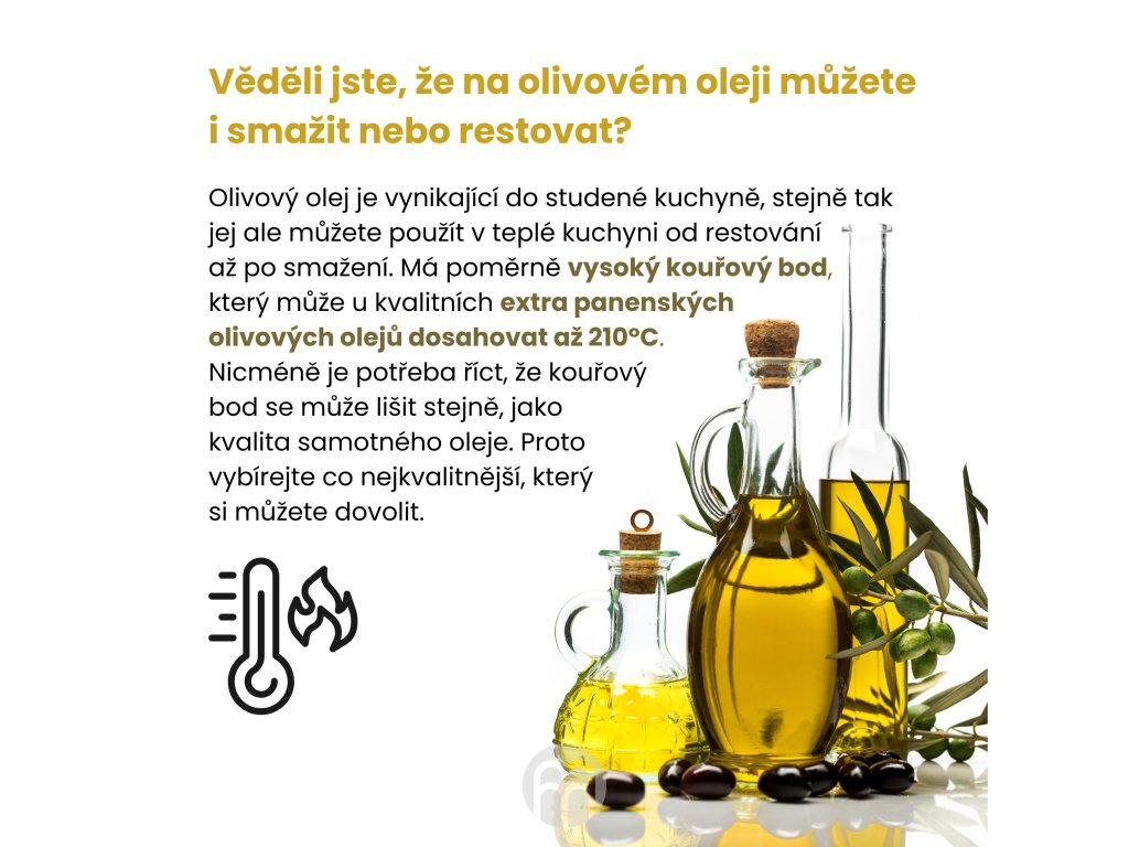 Extra panenské olivové oleje se získávají přímo z plodů a výhradně mechanickými postupy, mletím oliv. Zbývající kategorie olivového oleje, označovány jako „olivový olej“, se nevyrábí přirozeně, ale získávají se chemickou rafinací za použití kyseliny fosforečné. Celý proces extrakce oleje z čerstvých oliv probíhá pod 20ºC, což umožňuje, zachování jeho chuti, aroma i nutričních vlastností. Pro optimální zachování všech jeho vlastností jej doporučujeme skladovat mimo dosah světla a nejlépe na chladných místech. Ideální teplota skladování je 18ºC.