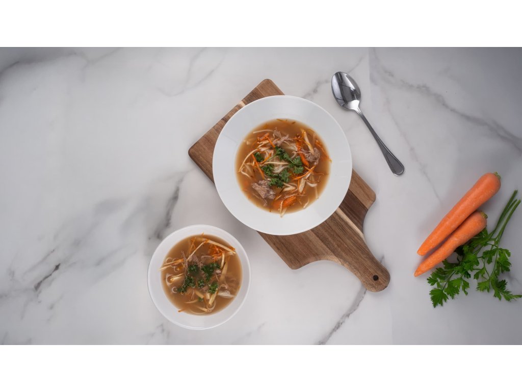 Náš BIO hovězí vývar je vařen pomalu a dlouze, aby získal maximum chuti a výživných látek z kostí i zeleniny. Díky pečlivému filtrování je dokonale čirý a připraven k okamžitému použití. Najdete v něm jen kvalitní suroviny – hovězí kosti, zeleninu a směs divokého koření.