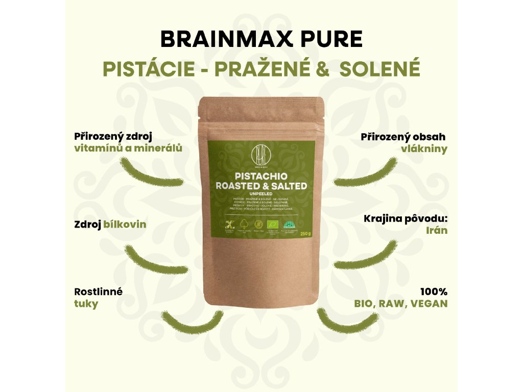 Pistácie jsou ceněné pro svůj výživový profil – přirozeně obsahují rostlinné tuky, bílkoviny (21,3 g / 100 g) a jsou součástí pestré rostlinné stravy. BrainMax Pure pistácie jsou neloupané, pražené a solené, ideální jako výživný snack nebo doplněk do salátů, kaší či směsí s ovocem.