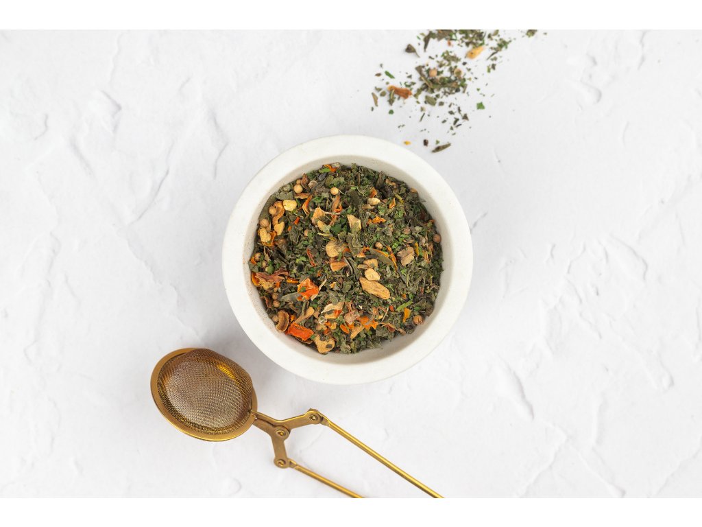 Složení: (20 %) zelený čaj Sencha*, zázvor*, mrkev*, bílý ibišek*, (10 %) jablečná máta*, rohovník*, koriandr*, petržel*. *produkt z ekologického zemědělství. Minimální trvanlivost (číslo šarže) na spodní straně. Uchovávejte v suchu chladu a nevystavujte přímému slunečnímu světlu.