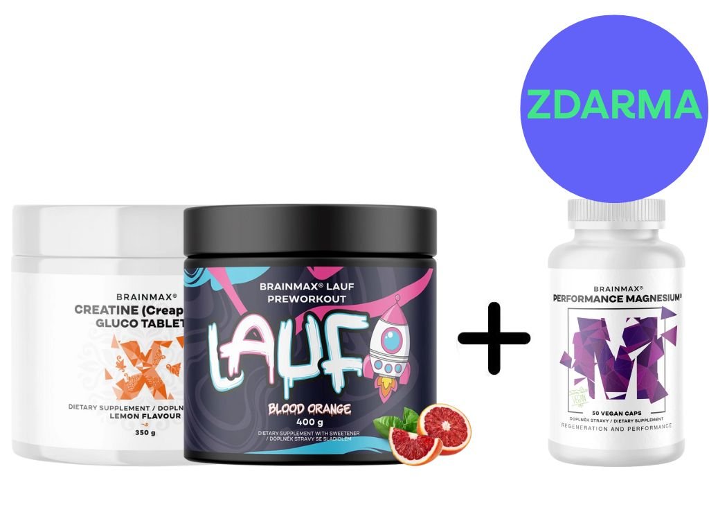 BrainMax LAUF Preworkout obsahuje komplexy látek pro svalovou pumpu, sílu, vytrvalost, motivaci, koncentraci, stimulaci a fyzickou i mentální odolnost. Aktivní látky a přírodní extrakty se navzájem doplňují, tak aby vše fungovalo pro zvýšení vašich výkonů. Pečlivě propracované složení na hraně současné legislativy udělá z vašich tréninků dechberoucí jízdu za překonáváním vlastních limitů. Brainmax Creapure® Gluco tablets jsou inovativní formou kreatinu monohydrátu, která kombinuje výhody vysoce čistého kreatinu Creapure® s přidanou glukózou pro lepší vstřebávání. Glukóza obsažená v těchto tabletách zvyšuje hladinu inzulínu, což urychluje transport kreatinu do svalových buněk a zajišťuje tak rychlejší a efektivnější regeneraci a zvýšení výkonu. Díky praktické formě tablet není potřeba se obávat přesného dávkování ani míchání, mají skvělou citronovou chuť a můžete si je vzít do kapsy a užívat po celý den.
