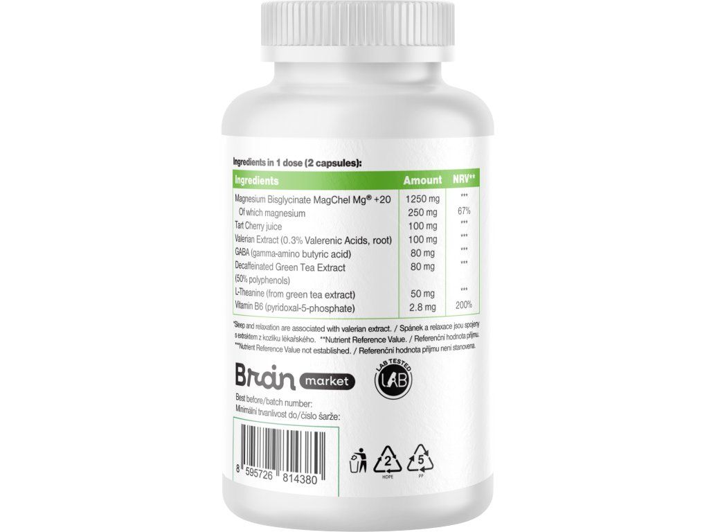 Složení: Magnesium bisglycinát MagChel® Mg +20, 1250 mg z toho hořčík 250 mg, Prunus Cerasus (šťáva z višní) 100 mg, Kozlík lékařský (0,3% kyseliny valerenové, kořen) 100 mg, GABA kyselina gama-aminomáselná 80 mg, Bezkofeinový extrakt zeleného čaje (50 % polyfenolů) 80 mg, L-theanin (z extraktu zeleného čaje) 50 mg, Vitamín B6 Pyridoxal-5-fosfát 2,8 mg. Rostlinná kapsle na bázi HPMC. Neobsahuje žádné balastní látky (éčka).