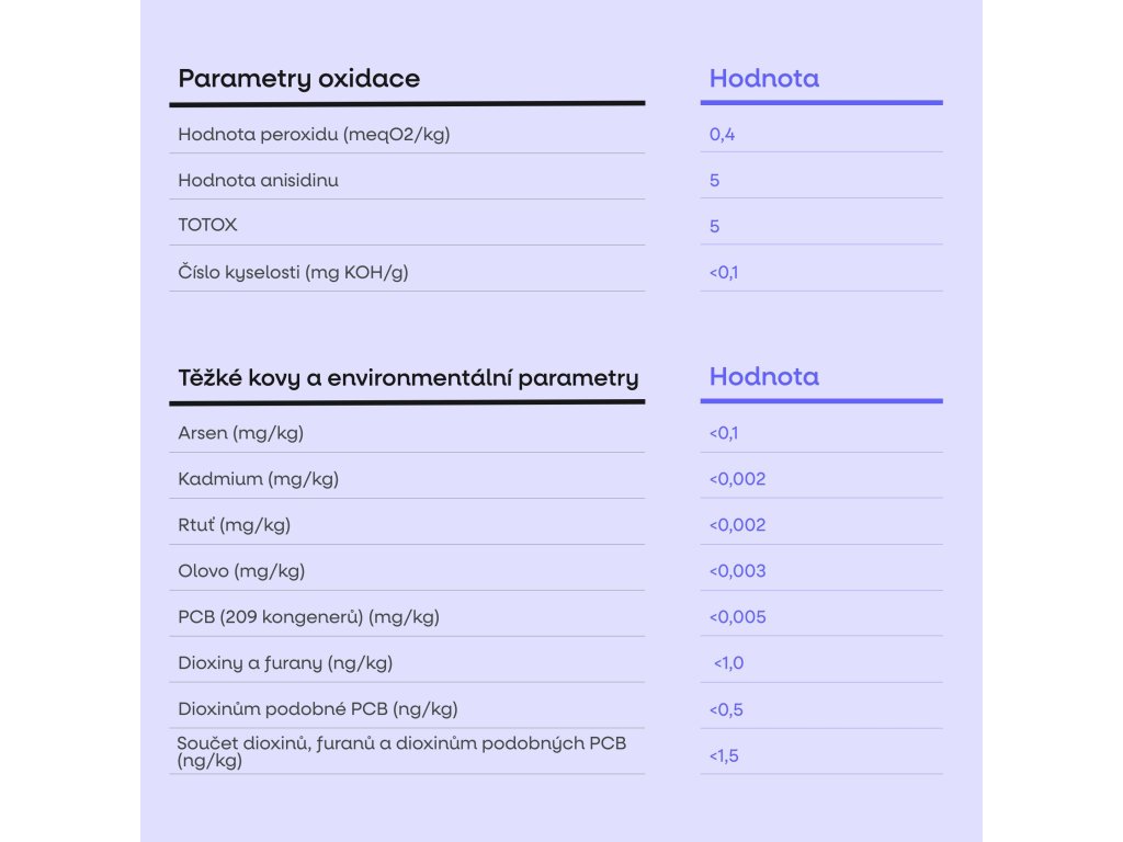 Oxidační stabilita a čistota určují kvalitu omega-3 olejů a jejich vliv na zdraví. Sledujeme proto ukazatele oxidace (TOTOX), čerstvost a stabilitu, stejně jako obsah těžkých kovů, mikroorganismů, dioxinů a PCB. Výrobce původně stanovil hodnotu TOTOX 5, zatímco nezávislá laboratoř naměřila TOTOX 7,35 – výsledek, který potvrzuje vysokou kvalitu a čerstvost oleje, zejména s ohledem na to, že vzorek již prošel transportem a manipulací mimo kontrolované podmínky výrobce. Analýzy tak jednoznačně potvrzují bezpečnost, stabilitu a vhodnost oleje pro dlouhodobou suplementaci.