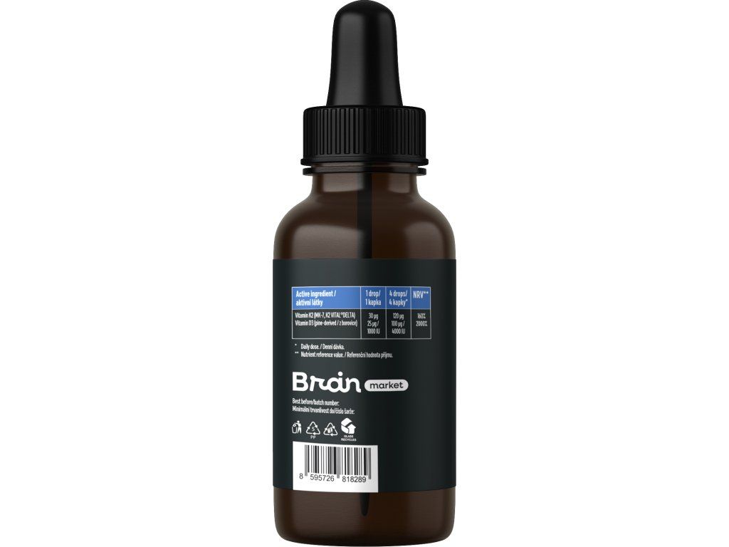 BrainMax Vegan Liquid D3 a K2 je prémiová formule navržená tak, aby vašemu tělu poskytla jednu z nejúčinnějších dávek na trhu a zároveň nabídla excelentní vstřebatelnost. V každé denní dávce získáte 100 µg vitamínu D3 z přírodního zdroje borovice a 120 µg vitamínu K2 MK7 ve špičkové kvalitě K2VITAL®DELTA, která je považována za nejstabilnější a nejčistší formu vitaminu K2. Oba vitamíny jsou rozpuštěny v MCT oleji z kokosu, který díky svému rychlému vstřebávání zajišťuje jejich optimální biologickou dostupnost. Tekutá forma umožňuje přesné a snadné dávkování, takže si dávku můžete přizpůsobit svým potřebám a ročnímu období.