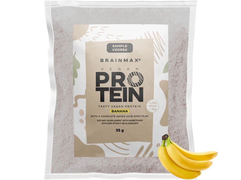 BrainMax Vegan protein, banán, 35 g 24 g bílkovin, 5,29 g BCAA, Kompletní Amino spektrum, Slazeno stévií, doplněk stravy