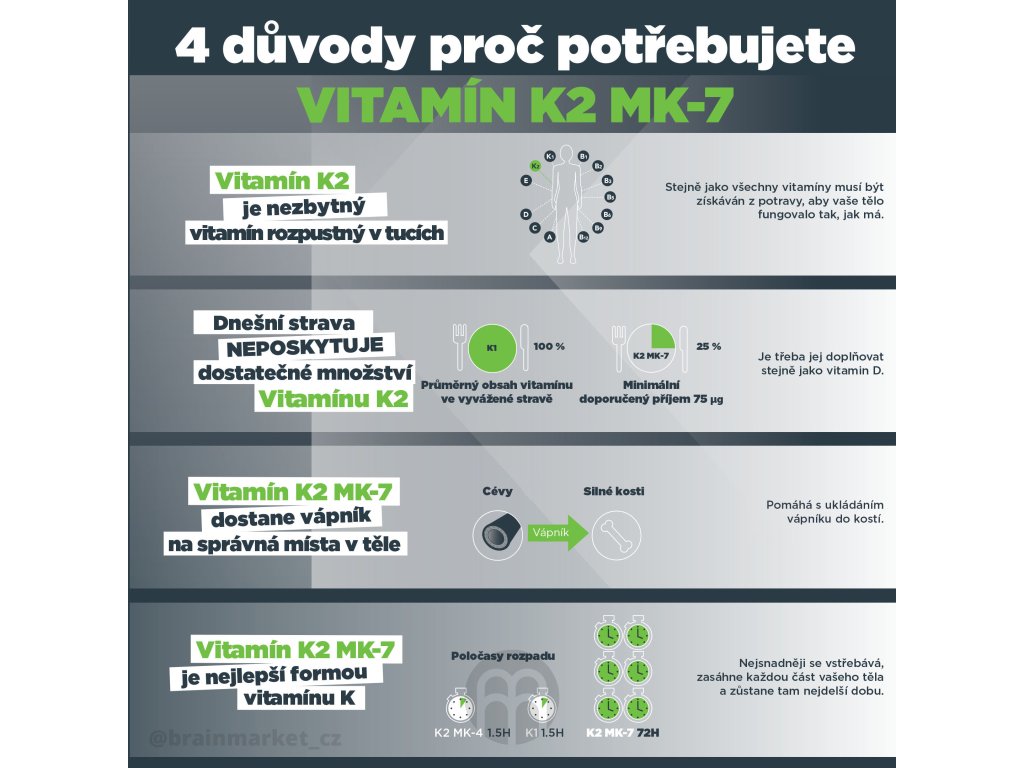 Vitamín K2 je vitamín rozpustný v tucích, který přispívá k udržení normálního stavu kostí. Přirozeně se vyskytuje ve fermentovaných potravinách, ale jeho příjem bývá nízký, zejména při moderní stravě. Forma MK-7 je nejlépe vstřebatelná a má nejdelší účinek v těle.Vysoce biologicky dostupná a využitelná forma vitamínu K2.