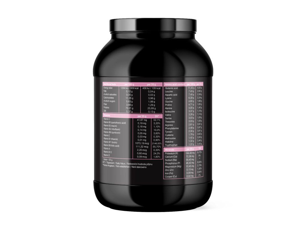 Aminokyseliny (na dávku 35 g): Kyselina glutamová 3,42 g, leucin 2,43 g, kyselina asparagová 2,24 g, lysin 2,04 g, glycin 0,38 g, prolin 0,90 g, alanin 0,90 g, isoleucin 1,09 g, valin 0,99 g, serin 0,85 g, threonin 0,94 g, arginin 0,48 g, fenylalanin 0,75 g, tyrosin 0,76 g, cystein 0,61 g, methionin 0,45 g, histidin 0,41 g, tryptofan 0,43 g.