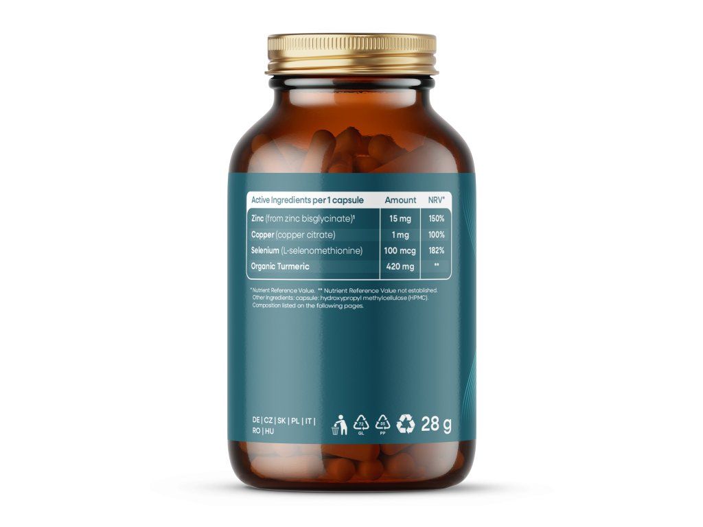 Složení v 1 kapsli: Bio kurkuma (Curcuma longa) prášek z kořene 420 mg**, kapsle: hydroxypropylmethylcelulóza (HPMC), zinek (bisglycinát zinečnatý) 15 mg (150 %*), měď (citrát měďnatý) 1 mg (100 %*), selen (L-selenomethionin) 100 µg (182 %).