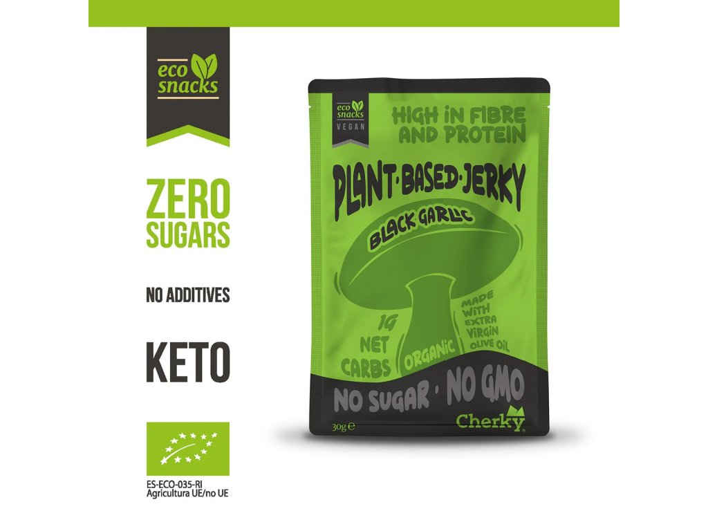 Cherky Plant Based Jerky Black Garlic & Coffee, 30 g BIO veganské jerky ze šitake, *ES-ECO-035-RI certifikát