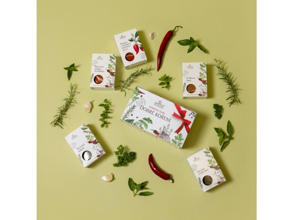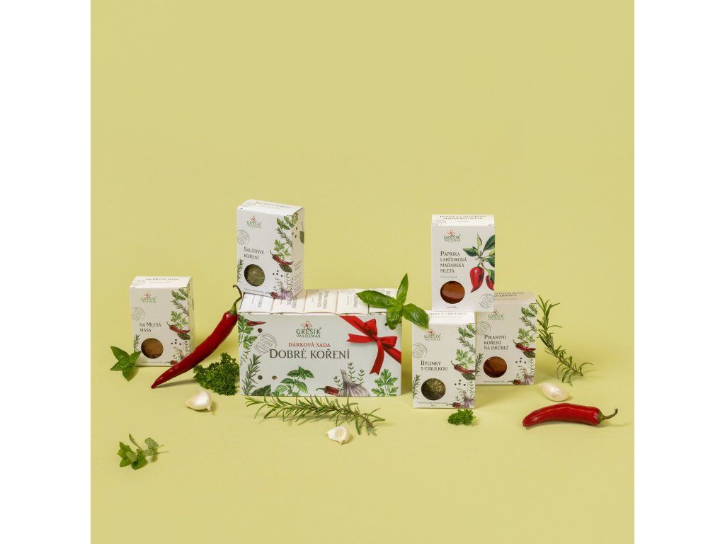 Grešík Dárková sada Dobré koření Kazeta pěti vybraných koření pro polévky, masa, drůbež i saláty