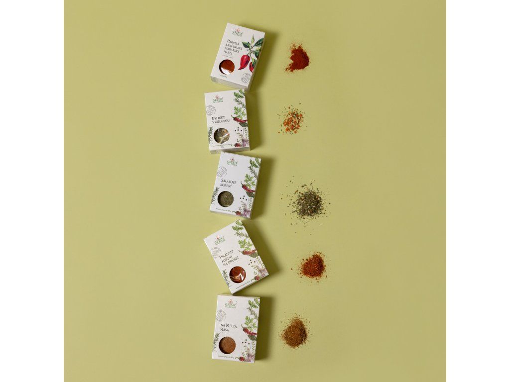 Objevte svět chutí s jedinečnou kazetou pěti koření, které promění vaše vaření v kulinářský zážitek. Obsahuje 5 druhů koření: Bylinky s cibulkou, Na mletá masa, Paprika lahůdková maďarská mletá, Pikantní koření na drůbež a Salátové koření