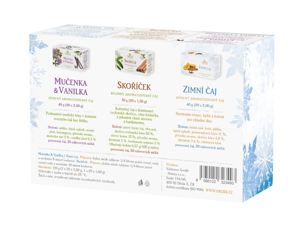 Tři jedinečné čajové směsi, které zahřejí v chladných zimních dnech a navodí atmosféru pohody. Ovocné i bylinné čaje s kořením potěší svou vůní i chutí. Od exotické kombinace mučenky a vanilky, přes Skoříček s jemně pikantní skořicí, hřebíčkem a zázvorem, až po harmonický Zimní čaj s ovocem, bylinami a kořením. Ovocné a bylinné čaje pro chladné zimní dny.